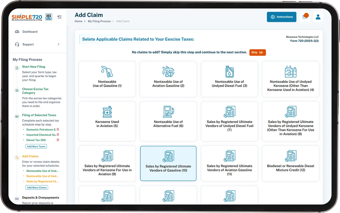 Simple720 made filing my claim for sales of gasoline incredibly easy. The clear, step-by-step instructions ensured I could complete the process quickly and accurately without any confusion.